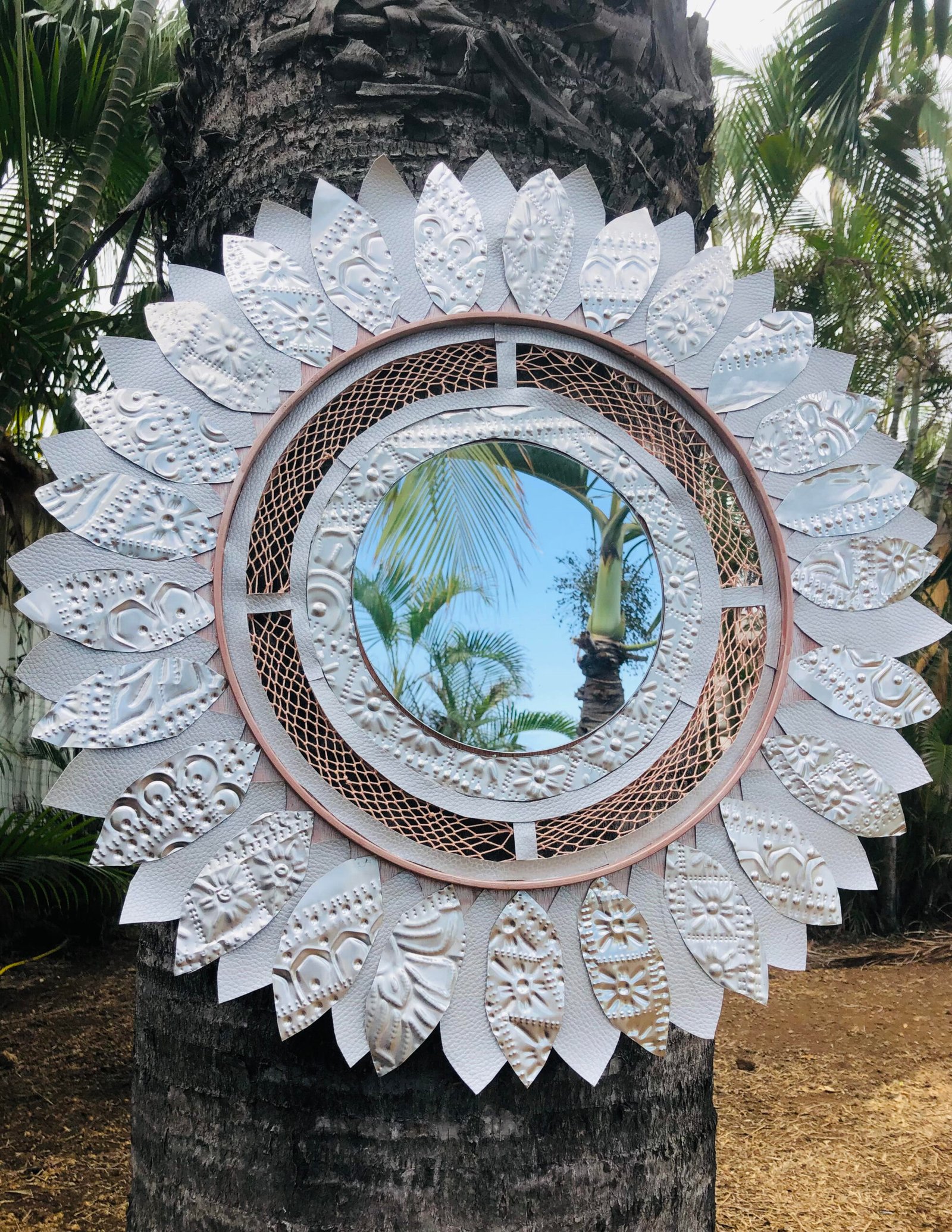 Découvrez le grand miroir « Plein Soleil », une œuvre d’art réalisé à l’aide de plusieurs matériaux tel que le similicuir argenté, l’aluminium, le bois, et un délicat tissage orné de touches de peinture couleur cuivre.